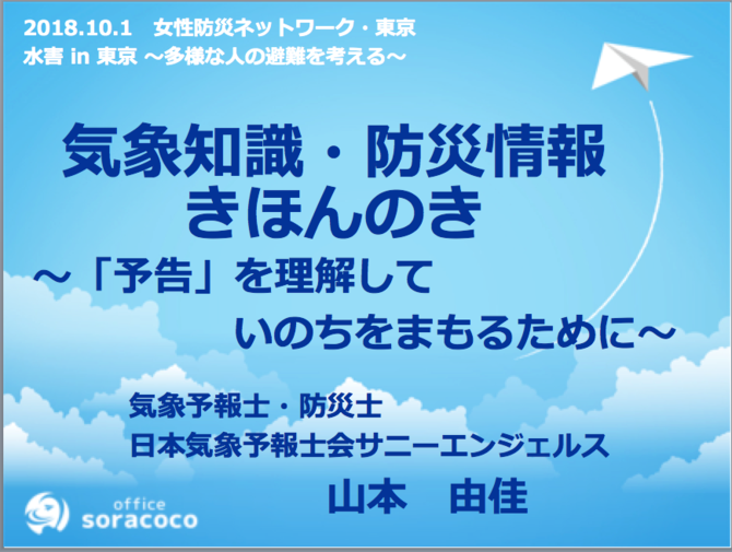 今回は、女性防災ネットワーク・東京で10月1日に実施した日本気象予報士会サニーエンジェルスの代表、山本由佳さんの報告がとてもわかりやすかったので、講演のまとめと私の感想をみなさまにご紹介します!特に、東京は大きな水害はない・・なんて思っている方にお伝えいただければ嬉しいです。