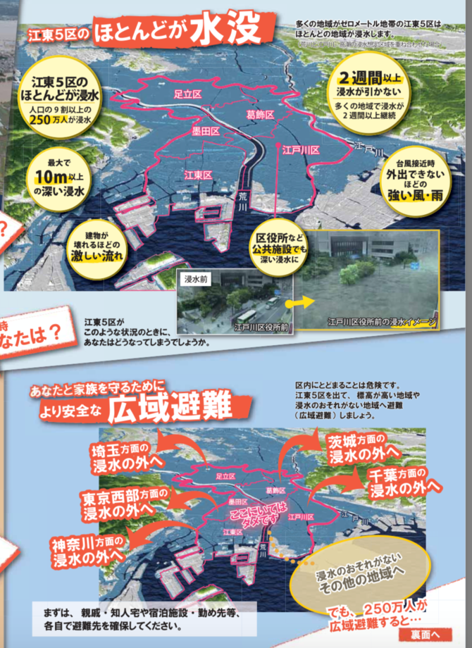 だからこそ、江東5区広域避難推進協議会で広域避難が検討されています。そして、対象になる水害は以下の2点です。