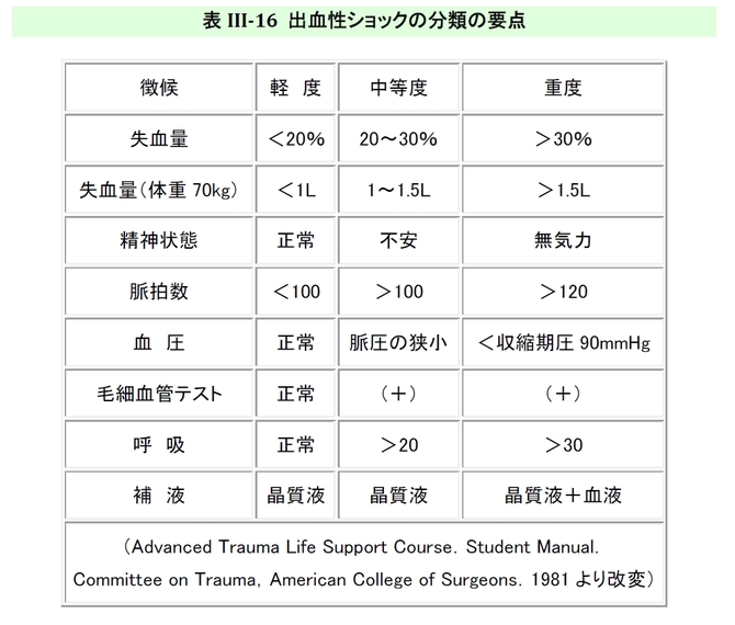 一般的に急性の20~30%の血液(体重70kgの人では1~1.5Lの出血)を急速に失うと出血性ショックという重い状態になる。