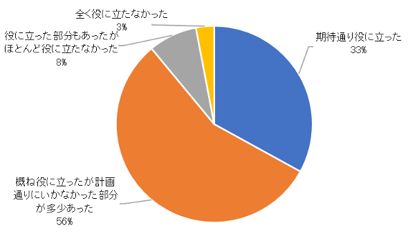 次に「直近のBCP発動時にBCPは期待通り役に立ちましたか?」という設問に対する回答結果は図2の通りであり、BCPが実際に役に立っている様子がうかがえる。前述のとおり実際にBCPに基づいて対処することをある程度経験し、その結果を踏まえて見直しがかけられた結果、組織の実態に合うようにBCPの調整が進んできた結果なのではないかと推測される。ちなみに回答者の73.5%が直近の BCP発動後にBCPを修正したと回答している。