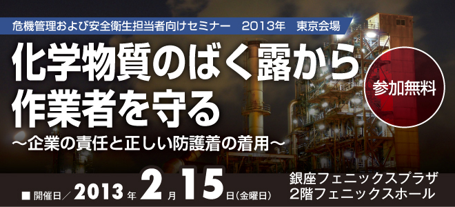 化学物質の漏洩・流出による事故や研究開発・生産過程における化学物質のばく露から作業者を守る為、化学物質の安全管理や従業員の安全対策がより一層求められています。企業および現場では、どのような対策を講じればよいのでしょうか? 本セミナーでは、工場作業にあたる従業員の安全・健康管理についてどのような事に注意が必要か。また、化学物質のばく露から作業者を守る為どのような安全対策が必要かを、各分野の専門家がわかりやすく紹介いたします。