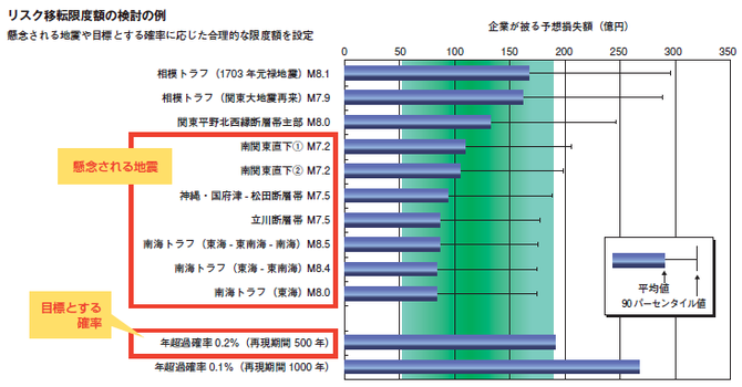 この金額が理論上の純保険料であり、極端な話ではあるが、これと同額を毎年積み上げていけば、上記で想定した地震被害についてはすべての費用が賄えることになる。ただし、すべての地震リスクについて想定することは現実的ではないため、例えば、150 億円の損害が1000 年に1度、つまり0.1%の発生の確率で発生するとしたら、企業の選択肢として、0.1%以下の確率で発生する地震リスクすなわち150億円以上の損害は保有する、つまり地震保険の対象にしないという判断をすることもできる。また、30億円以下の被害は自己資金で保有するという判断もできる。