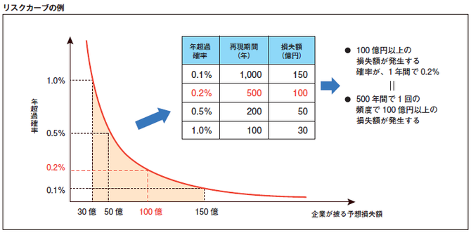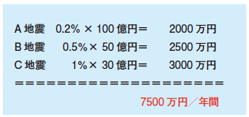 例えば100 億円の被害が予想されるA 地震が500 年に1度の確率で発生するとすると、1年間の発生確率は0.2%となり、1年間に発生すると考えられる期待損失額に換算すると0.2%× 100 億円で、2000 万円となる。つまり年間2,000 万円ずつ、500年間積み上げれば100 億円が支払えるという計算。また、これとは別に50 億円の被害が予想されるB地震が200 年に1度の確率で発生するとすると、1年間の発生確率は0.5 %で、期待損失額は0.5%×50 億円で2500 万円となる。さらに別の30 億円の被害が予想されるC 地震が100 年に1度の確率で発生するとすると、発生確率は1%で期待損失額は1%× 30 億円で3000 万円。これらを合計すると、この企業の地震リスクに対する年間期待損失額は7500 万円となる。