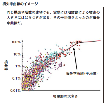 動の大きさによってもたらされる被害損失の大きさとの関係(損失率曲線)が過去の被害データなどから計算されており、企業が所有する施設の所在地、階数、構造、建築年などを入力することで、想定地震による被害率が算出される仕組みだ。これに、施設の再調達価額、つまり現状で同じ施設を建てるために必要な金額を掛け合わせることで損害額(復旧費用)が把握できるようになる。建物内部の機械設備や在庫品などについても、それぞれ損失率曲線が用意されており、これらも同様な方法で算出される。