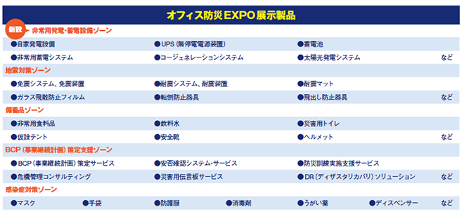 今年で7回目の開催となるオフィス防災EXPO。今年は「非常用発電蓄・電設備」「地震対策」「備蓄品」「BCP策定支援」「感染症対策」の5つの専門ゾーンで構成。関連技術や製品・サービスの出展が予定されている。