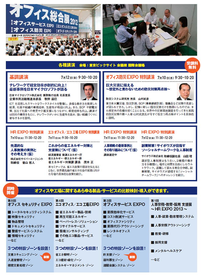 会期中のセミナーも多彩なテーマで展開される。特別講演は、初日の7月10日(水)に「巨大災害に備える~想定外と言わないための防災対策再点検~」と題して、防災システム研究所所長の山村武彦氏が講演。このほか、オフィス総合展の基調講演として、7月12日(金)に日本マイクロソフト株式会社業務執行役員社長室長の牧野益巳氏が「テレワークで経営効率が劇的に向上!最新事例を日本マイクロソフトが語る」と題し、講演を予定する。