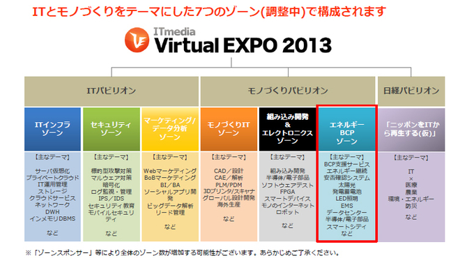 Virtual EXPO 2013は、ITとものづくりをテーマに、「ITパビリオン」「モノづくりパビリオン」「日経パビリオン」の3つのパビリオンで構成され、リスク対策.comでは、ものづくりパビリオン内の「エネルギーBCPゾーン」に企画協力しています。