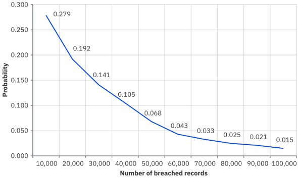 なお図2は前回の報告書にはなかったグラフであるが、過去24カ月間のデータをもとに情報漏えい事案の規模(漏えい件数)(横軸:Number of breached records)と、そのような事案が発生する確率(縦軸:Probability)との関係を図示したものである。あくまでも本報告書における調査対象から算出した数字であるから、このデータそのものを一般的に当てはめることはできないであろうが、事案の規模が大きくなればなるほど発生確率が小さくなっていく状況がきれいに現れていて興味深い。