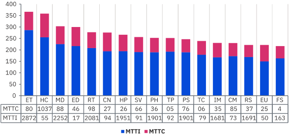 また図1は情報漏えい事案が発生してから事案の発生が検知されるまでの日数と、漏えいを食い止めるための対処をするためにかかった日数とを、業種ごとに分けて示したものである。「MTTI」と「MTTC」との意味は注2を、また業種の略号については注3をそれぞれ参照されたい。前回の報告書を紹介した記事と見比べていただくと、全体的に日数が長くなっていることがわかるが、その理由や背景などについては本報告書の中では特に言及されていない。