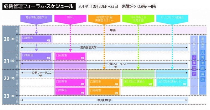 | ■開催期間:2014年10月20(月)~23(木) ■開催場所:朱鷺メッセ 新潟コンベンションセンター 〒950-0078 新潟市中央区万代島6-1 TEL:025-246-8400 ■特別協力:新潟県、新潟市、北陸地方整備局、新潟日報社、新潟大学 ■特別共催:(公社)日本技術士会北陸本部、にいがたGIS協議会 |