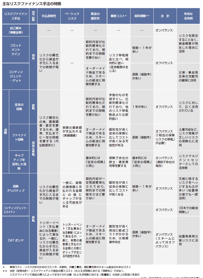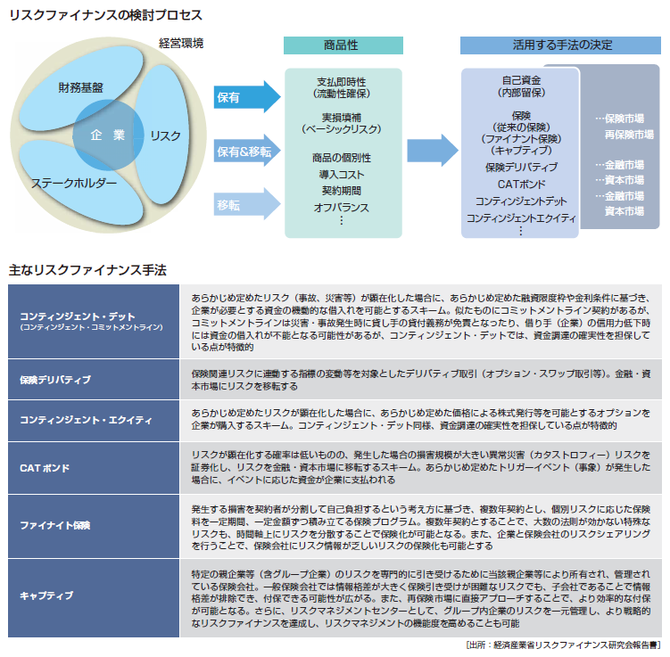 経済産業省が2006 年3 月にまとめた「リスクファイナス研究会報告書」には、リスクファイナンスの種類や特性、企業にとっての最適化を考える視点がまとめられている。それによると、リスクファイナンスの最適化を図るには、①各企業が置かれた経営環境②財務状況③ステークホルダーからの要請④全社的なリスク評価結果̶̶を把握し、その上で保有可能なリスクと外部移転すべきリスクの峻別を行い、さらに、リスクファイナンスで手当てすることにより得られる効果と、導入に要するコストを勘案した上で、自社にとって最適な手法を決定することを求めている。また、企業の内部状況(財務状況など)や外部環境(顧客動向、経済動向、法制・税制など)の変化を踏まえることが重要な視点としている。