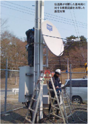 基地局の復旧作業は、同社のBCP に従い、被災した当日から開始した。BCP の中で、停電対策として基地局に予備電源や発電機を搭載していたことや、複数の基地局を結ぶ伝送路にバックアップ用の迂回路を設けるなど対策を整えていたことが復旧に役立ったという。作業に当たったのは、800 名近い技術者メンバー。甚大な被害を受けた地域の基地局に移動基地局車10 台を出動させたほか、伝送路が切断した基地局には衛星回線を活用した通信対策を施した(写真)。さらに、社内公募で集まった440 名のボランティアメンバー