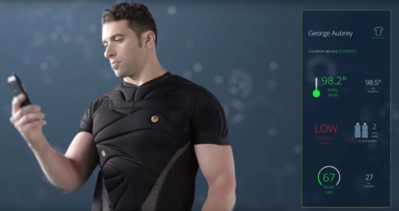 AI搭載のジャケットには、防弾、防刃、GPS、体温センサー等が装備されており、防水のスマホや空気呼吸器の面体に体温上昇による脱水症状予防アラートが、現場活動隊員自身と現場指揮者側で常時、把握できるようになっている。