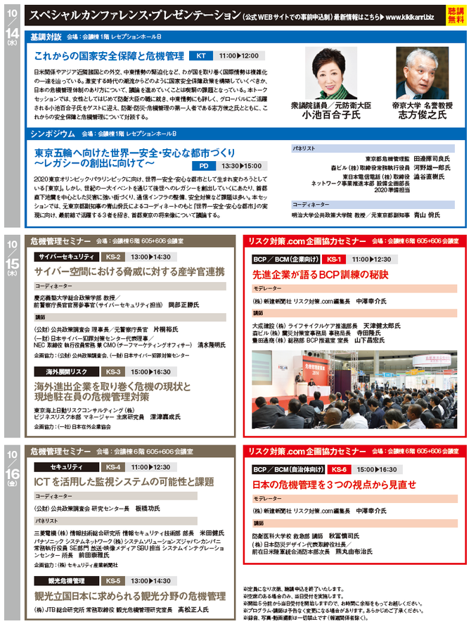 オープニングを飾る基調対談には、女性として初めて防衛大臣の職に就き、中東情勢にも精通する小池百合子氏がゲストとして登壇。帝京大学名誉教授の志方俊之氏とともに、「これからの国家安全保障と危機管理」について対談が行なわれる。同日には、「東京五輪へ向けた世界一安全・安心な都市づくり」をテーマにしたシンポジウムが開催されるほか、2日目以降も企業・自治体のBCPや海外展開リスク、観光危機管理、ICT監視システムなど多彩なセミナーが開催される。さらに、出展者プレゼンテーションも多数開講予定。全セミナー公式サイト(http://www.kikikanri.biz/)より事前申込みでき、無料で聴講可能だ。