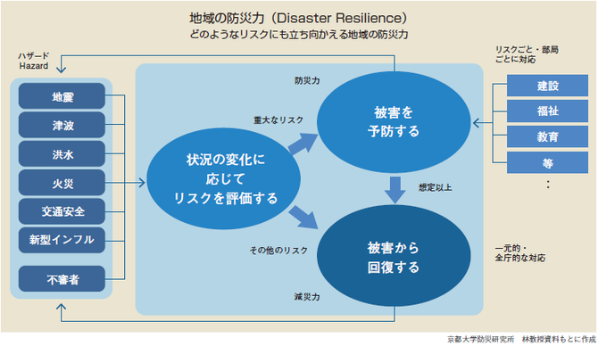 では、地域や組織のレジリエンスを高めるのに必要なことは何か。林教授は、リスク評価と被害の予防、被害を受けた時の対応の3つをポイントとして提示する。