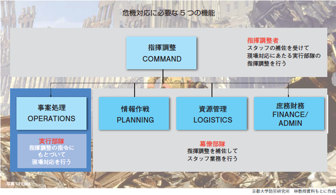 ICS は、複数組織間の調整を目的に1970 年代にカリフォルニアの森林火災に対する消防組織が開発したもの。あらゆる緊急事案について共通に必要となる機能として、指揮調整(Command)、事案処理(Operation)、情報作戦(Planing)、資源管理(Logistics)、庶務財務(Finance/Admin)の5機能を定め、それぞれにどのような役職を置くか、その担当者が具体的にどのような行動をするのか、責任と権限、指揮命令系統などが、すべて統一された言葉や様式で決められている。いわば、危機対応に関する標準的な組織運営体制を定めた規格である。