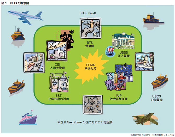 図1は、林教授がまとめたDHS の概念図だ。入国管理を行う移民局(CIS)、港の警備にあたる国境・運輸保安局(BTS)、要人の警備(USSS)、沿岸警備(USCG)など、海外からの敵を守るため何重にも警戒態勢を固め、それでも最後に被害が出た時には、資金面も含めた対応を連邦緊急事態管理庁(FEMA)が行うことになっている。