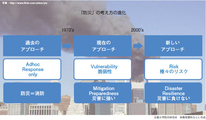「防災は、かつては消防と同じ言葉のように使われていた。災害が起きるかどうかは神のみぞ知ることで、起きたらその時対処するしかないという考え方だった。ところが1970 年以降は、被害を抑止する(Mitigation)、軽減する(Preparedness)という概念が加わり、災害時の脆弱性(Vulnerability)を取り除いていくという考え方に変わった。そして9.11 は、地震など特定の災害だけではなく、様々な脅威に対しても備えていかなくてはいけないことを世界に知らしめた。この頃をきっかけに、防災は、災害の種類に関わらず、それに負けないという概念に変化を遂げようとしている」(林教授)。