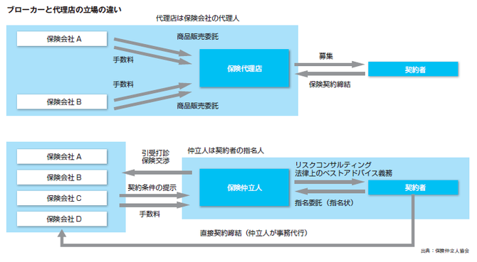 保険ブローカーとは「保険契約者と保険会社の間に立って、契約者のために最適な保険契約の締結の実現に向けて尽力する者」とされています。損害保険ブローカーと代理店の立場の違い会社は損害保険の引受けを行うだけです。