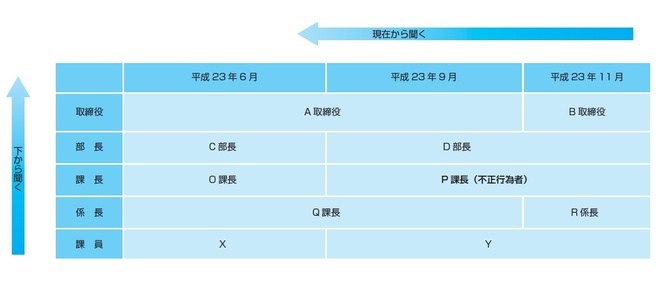 表中のP課長が不正行為をはたらいたとの嫌疑で社内調査が開始されたとします。嫌疑対象者たるP課長から最初に事情を聞いてはなりません。ヒアリングを実施する順番がとても重要です。「縦」の 関係でいうと、 上からは聞くのでなく「下から聞く」 、 そして「横」の関係でいうと「現在から聞く」ということが原則です。上から聞いてはいけない理由は、ある担当者が嫌疑者であるとするとその上司も関与している可能性があり、最初に当該上司からヒアリングを実施すると、当該上司によって事件がつぶされてしまう可能性があるからです。
