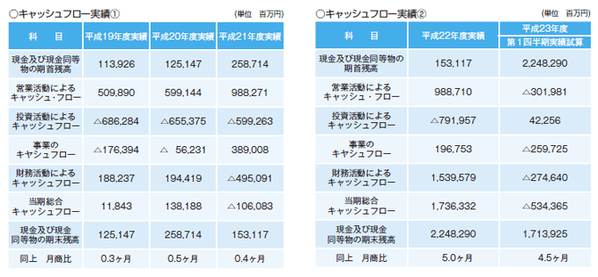 しかし、3月11日の東日本大震災発生後わずか12日目の3月23日に「三井住友銀行など3メガバンクと中央三井信託銀行など4信託銀行に2兆円規模 (月商の5カ月分)の緊急融資を申し込んだと報じられました。(雪印の場合は6月27日事故発生の3週間後に300億円〈月商の0.6カ月分〉を貸し出すと報道) 融資が実行された結果、現金及び現金同等物の期末残高は、2兆2482億9000万円、月商の5.0カ月分と大幅に増加しました。この時期に巨額の融資を申し込んだ理由は外部からはうかがい知れませんが、多分、将来の業績・キャッシュフローについて重大な 局面に至ると予測されたからだろうと推測致します。