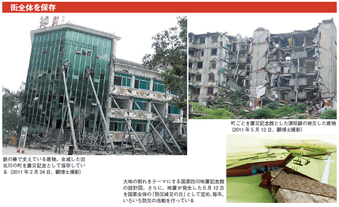 東日本大震災では、被災地の一部をメモリアルパークとして保全・整備することが検討されているが、中国では、四川大地震で被災した都江堰市や北川県、漢旺鎮などの街並みが、すべてそのままの状態で保存されている。何も手をつけないで放置しているわけではない。倒れかかったビルなどをその状態で耐震補強し、地震の恐ろしさを後世に伝える防災博物館としているのだ。