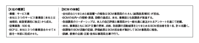 ここではまず、架空の会社X社を想定します。社におけるBCM活動の背景や前提条件は次のとおりです。