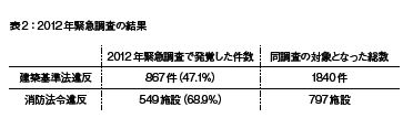 2012年に発生したホテル火災による死亡事件をうけ、国土交通省・総務省消防庁が連携して緊急調査が行われた。その結果は、表2のとおりである。