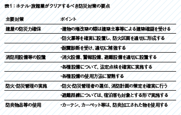 ホテル・旅館業では、過去幾度となく大規模火災による死傷事故例が発生しており、建築基準法や消防法に基づき、様々な対策が義務付けられている。特に重要な対応策としては主に以下の4点がある。