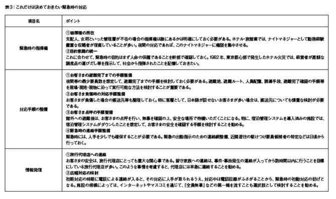 いかなる自然災害、事件事故にも共通して考えておくべき緊急時の対応方針として、最低限の項目はルールを決めておく必要がある。その一覧は表3のとおりである。