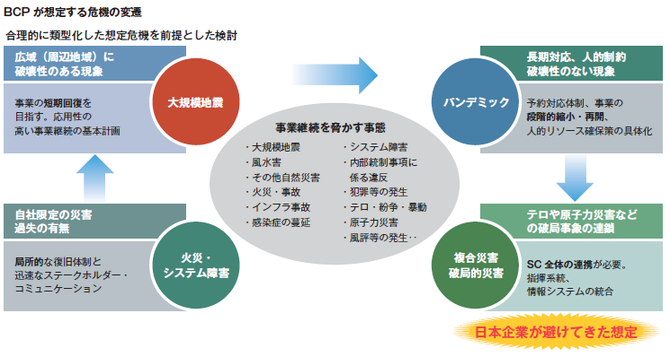 まず、BCP の「前提条件」に問題はなかったか、 被害想定や想定シナリオを固定化して、対応できる 範囲の限定的な検討だけに終始していたのではない か。また、 「検討体制」はどうか。サプライチェーンやステークホルダーを見渡した計画になっていた か、経営層にまで優先業務の考え方が浸透していた か、などを見直す必要もある。