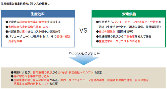 BCP の強化を図る上で、平時の生産効率の追求 と災害時の安定供給の確保という二律背反の問題に 直面する。生産効率の追求とは、例えば余剰在庫も 余剰設備も保有しないで、コスト競争力を高めるこ とだ。一方、災害時の安定供給の確保のためには、 平時から生産拠点の分散化や複社購買等によってバリューチェーンの冗長化・分散化を図る必要がある。 企業はこの二律背反の問題に対して基本的な方針を 定めなければならない。