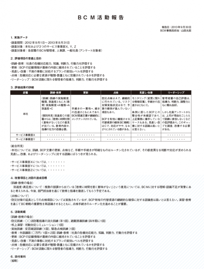 ⑤活動実績ここには、各部門におけるBCM活動の実績データを箇条書きや表形式でまとめます。必要なデータの種類としては、5つの評価指標のうち、リーダーシップを除く{訓練・教育、更新、見直し・改善、点検}について、実施頻度、活動に費やした時間、活動に費やした費用(予算/実績)など、定量的、客観的に捉えられるものを掲げるとよいでしょう。