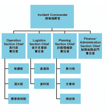 通常市民レベルのCFRまたはCERTではチームリーダー以下、実行部、後方支援部、計画情報部の4つの機能で対応することになる。