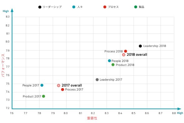 まず図1は前回と今回の調査結果の全体的な比較である。全体の平均(overall)の他に、16の要素を4つのカテゴリー(リーダーシップ/人々/プロセス/製品)に分けた上で、カテゴリーごとの平均の比較も示されている。どのカテゴリーにおいても全体的に重要性とパフォーマンスとのいずれも向上していることがわかる。