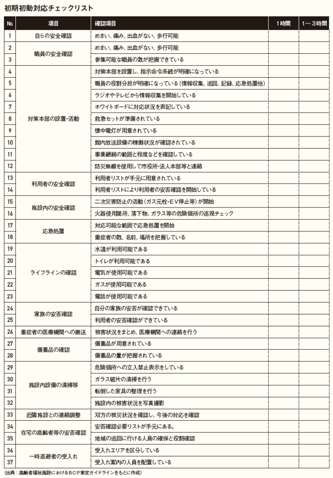 震災直後のチェックリスト(特別養護老人ホームの例)は、以下をご参照ください。