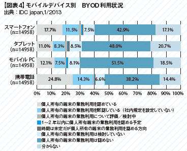しかし、2013年1月にIDCJapan株式会社が公表した「2013年国内BYOD利用実態調査」では、1割前後の企業が個人デバイスの業務利用を黙認していました(図表4)。また、2014年3月にITproActiveが公表した「モバイル機器の業務利用実態調査」によれば、個人デバイスを業務に利用するBYODは43.2%である一方で、BYOD利用者のうち22.2%の勤務先がBYODを禁止しています。こうした調査結果をみても、企業・組織の管理が及ばないところで行われているBYODは、少なくないことが分かります。