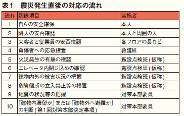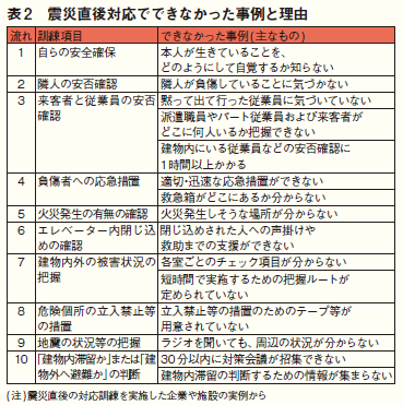震災発生直後の流れについて訓練(表1)してみると、ほとんどの企業や施設でできませんでした。これは、BCPや対応マニュアルができているところにおいても、同様の結果でした。