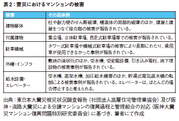 これまで紹介したものを含めて、過去の大規模地震におけるマンションの主な被害を表2のとおり取りまとめた。