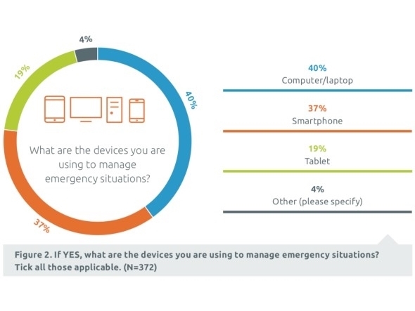 新しく加わった調査項目のひとつが、緊急事態管理においてどのようなデバイスが用いられているかという調査である。まず本報告書の本文で最初に示されているデータは、緊急連絡システムや緊急事態管理用ソフトウェアを活用しているかどうかを尋ねた結果であるが、回答者の6割程度がこのようなシステムやソフトウェアを活用していると回答している。