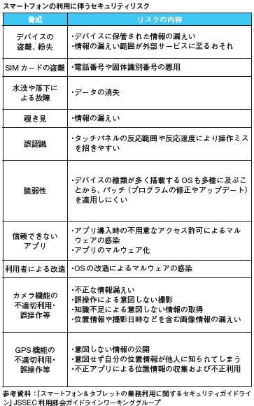 この他、タッチパネルの操作ミス、信頼できないサイトからのアプリのダウンロードによるマルウェア(ウイルス、スパイウェアなどの悪意あるソフトウェアやプログラム)の感染、利用者による改造、カメラ機能やGPS機能の不適切利用・誤操作等による情報漏えいのリスクもあります。スマートフォンを業務用ツールとして利用するにあたっては、これらのセキュリティ上の課題があることを認識したうえで、対策を講じることが必要とされます。