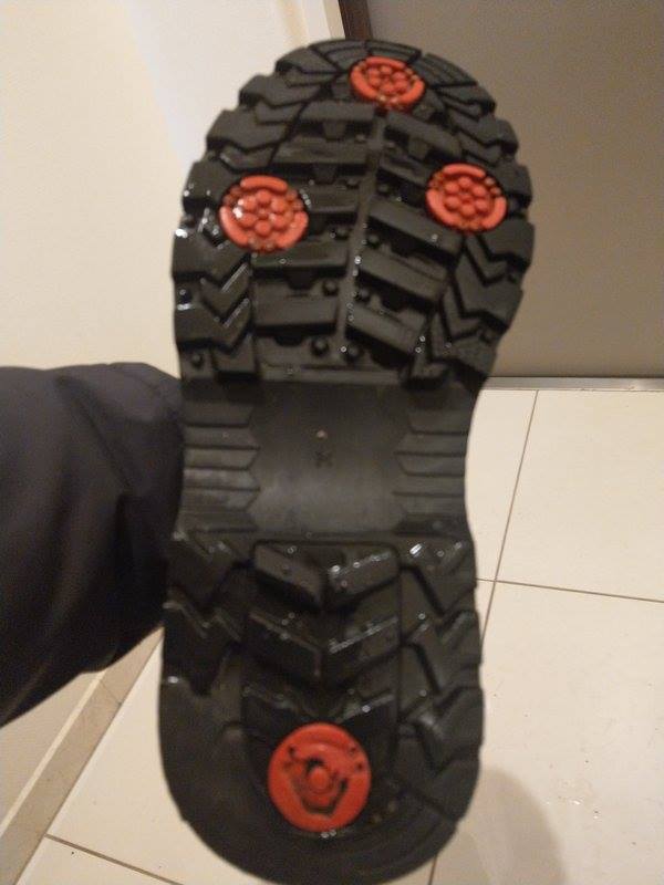 ただのゴム底では滑りやすい。底に滑り止めが付いたものを勧める(写真は筆者が使用している樹脂スパイクタイプ)。