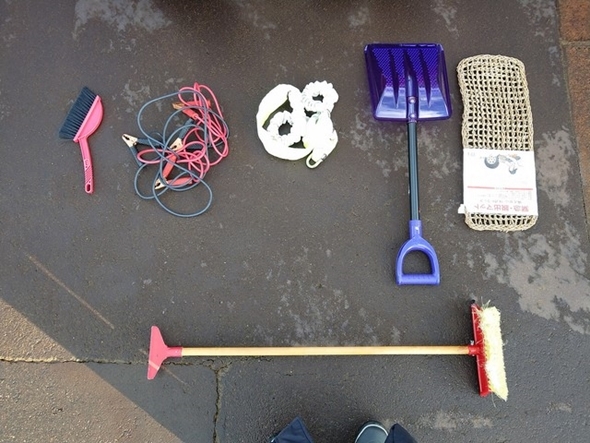 雪国のドライバーは写真で示すような冬装備をたいがい持っている。スコップ、脱出用マット、雪下ろしワイパーは持っておくことを勧める。