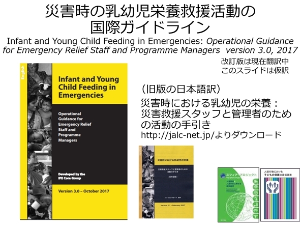 OG-IFEって何?と聞きなれないかもしれません。これは、WHO(世界保健機関)、UNICEF(国連児童基金)、WFP(国連食糧計画)、UNHCR(国連難民高等弁務官事務所)などの国連機関や複数の人道援助団体からなるネットワークが発行した、災害時の乳幼児栄養救援活動の国際ガイドライン(2017年訳ではOG-IFEを「活動の手引き」と訳しています)です。