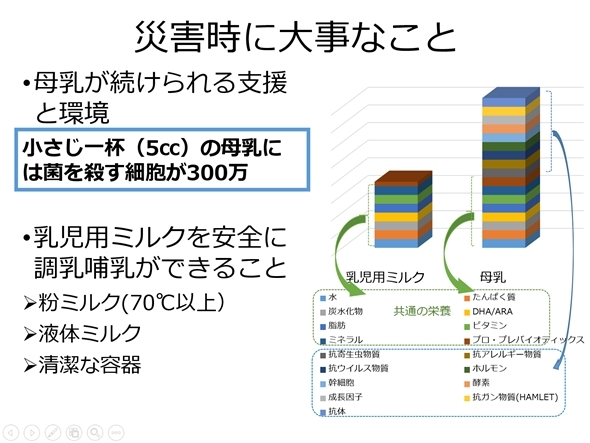 衛生状態が確立されている日常と異なり、災害時、赤ちゃんを感染症や下痢から守るために、母乳だけに入っている抗ウィルス成分、抗寄生虫物質、抗ガン物質、抗アレルギー成分、抗体がとても重要になってきます。