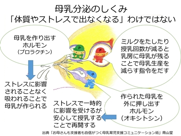 そうは言っても一時的でも母乳を押し出す機能が弱まると、赤ちゃんはぐずりだす可能性があります。その時、母親はとても不安になります。母乳がストレスで足りないのではないかと思いがちです。こんな時にミルクをあげたらいいのではと提案されると、すぐにでもあげたくなりますね。でも、赤ちゃんはいつもと違う雰囲気に不安を感じて泣いているのかもしれません。吸い始めてから母乳が出てくるまでにいつもより少し時間がかかるだけかもしれません。そうであるのに、不安になってミルクをあげると、もうひとつの作用が働く可能性があります。それは、赤ちゃんが母乳以外のものを飲むことで吸う回数が減って乳房に母乳が残ると、体は、もう母乳をつくらなくていいと判断するので、母乳を減らす指令を出します。つまり、ストレスで母乳は完全には止まらないけれど、ミルクをあげると母乳の産生が止まっていく可能性があるのです。