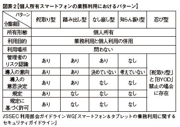 企業等における私物スマートフォンの業務利用状況に関して、日本スマートフォンセキュリティ協会(JSSEC)利用部会ガイドラインワーキンググループ(WG)では、「スマートフォン&タブレットの業務利用に関するセキュリティガイドライン」において、次の5つのパターン(図表2)に分類しています。