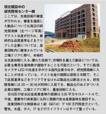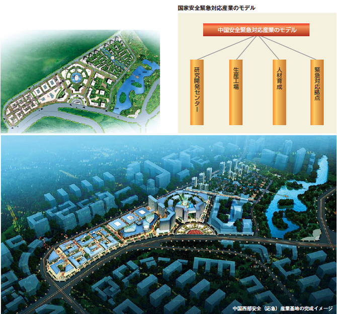 中国の内陸部で急成長を続ける重慶市で、危機管理に関する最先端の製品、人材を生み出す国家レベルの工業団地「中国西部安全(応急)産業基地」を建設するプロジェクトが始まっている。国内外の企業や専門家などから高い知識や技術を集結し、それをもとにさまざまな製品を開発。同時にその製品が国内全域に普及するよう市や国が支援する。製品開発のための費用は必要に応じて投資グループが出資する。