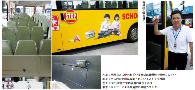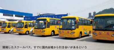 これまでも中国国内にはスクールバスの安全基準はあったが、このバスの開発により、来年にも、 GPS 機能やタイヤの ABS 機能などが新たに中国の スクールバスの安全基準に加えられることになると いう。仮に、私立、国立、公立すべての学校がこの バスを購入したとすると、中国全土では 4000 億元 (4兆 8000 億円)の市場が見込めることになる。