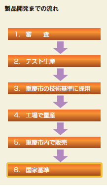 テスト生産を終えた企業は、基地内の工業生産エ リアに移り、工場を構えて量産体制に入る。基地で 生産した製品は、まず重慶市内で販売され、さらに 製品に関する安全基準、市場の反応、社会的貢献度 が認められた場合は、その製品技術が、今度は基地 や重慶市政府の推薦によって国家基準となるように 申請される。最終的に国家基準になった製品は、全 国の地方政府や企業への普及がより一層しやすくな るという仕組みだ。